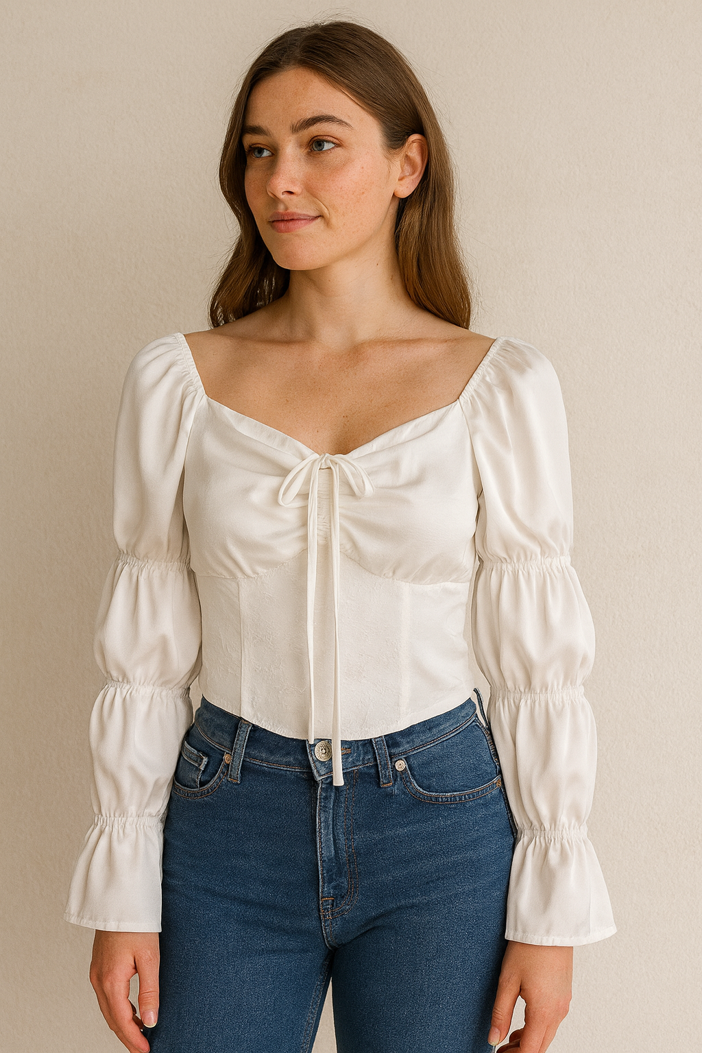 A romantic blouse with a sweetheart neckline, puffed long sleeves, and a flattering corset-style fit. Effortlessly pairs with jeans or skirts for both casual and dressy looks.