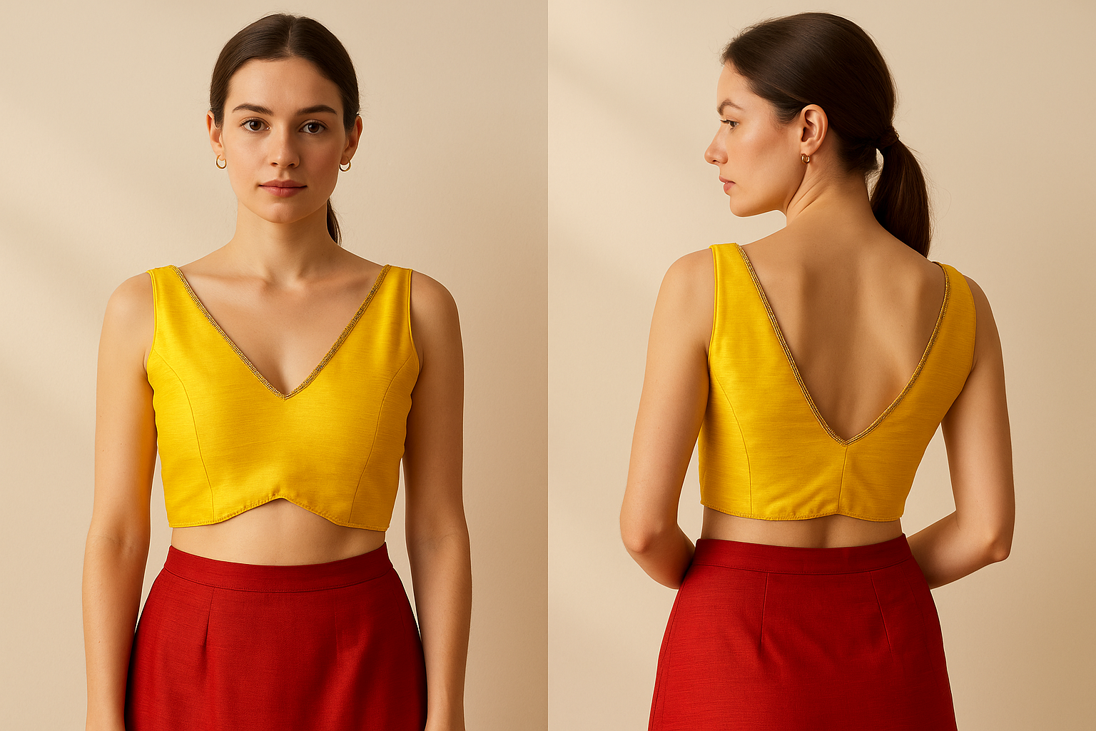Bright mustard yellow with minimal bead embroidery through neckline with V- front and back neck cut gives a structured and chic silhouette. It can be style with sarees, lehenga skirt for festive wear or even Indo-fusion looks with palazzos or high waist trousers.